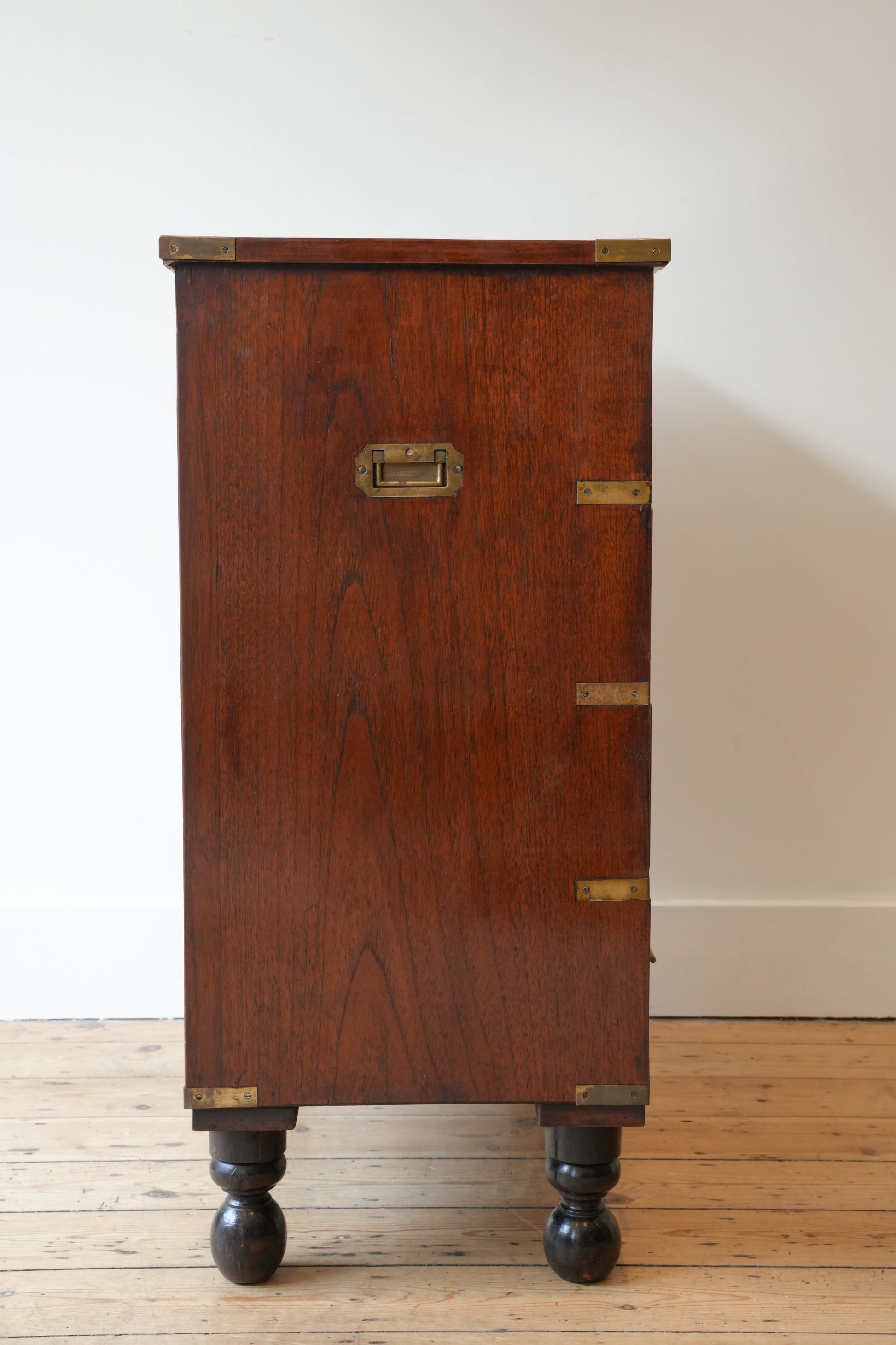 The most beautiful diminutive early Victorian campaign chest with wonderful ebony inlay, little bun feet, brass drawer pulls and carry handles.