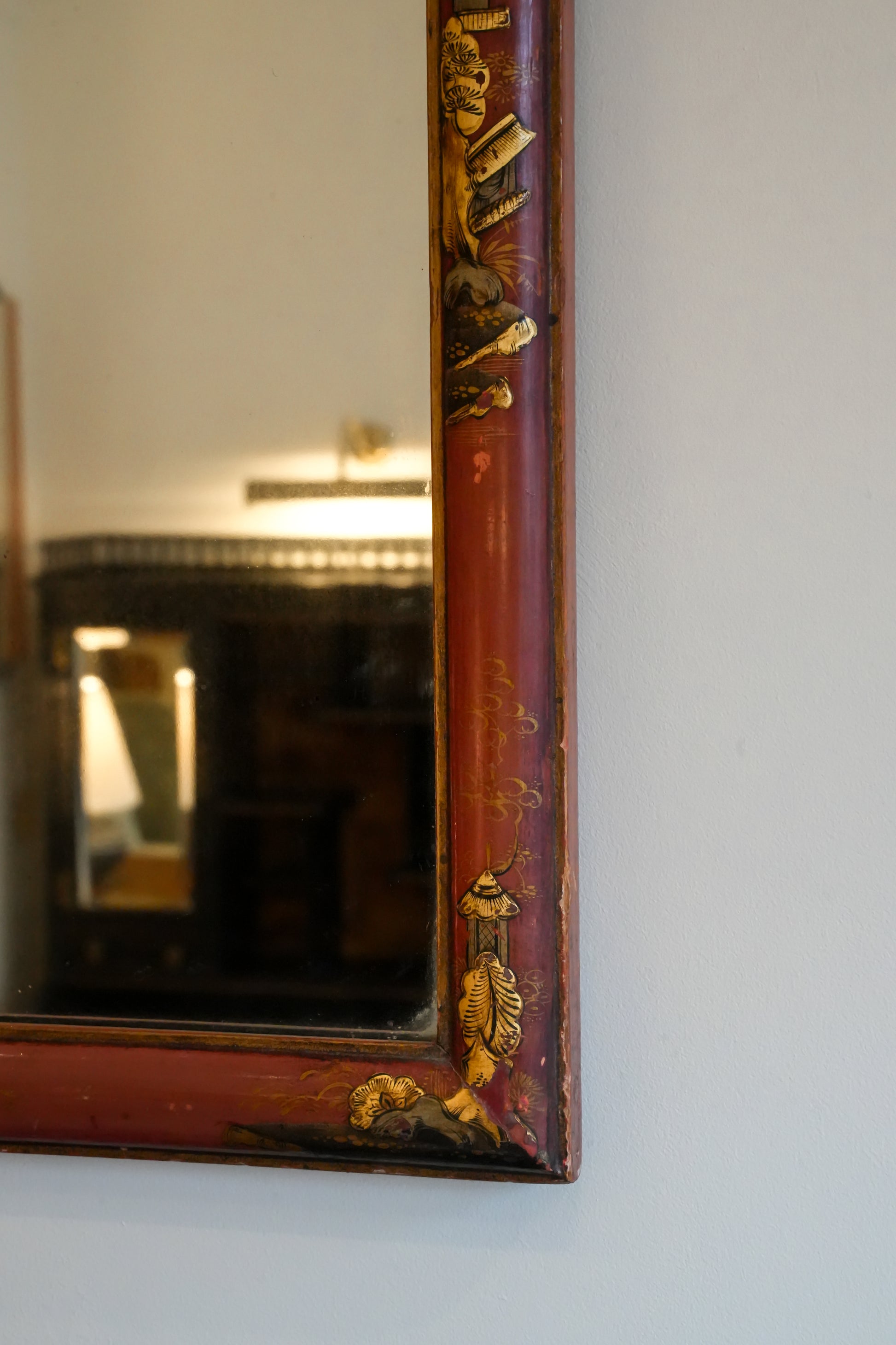 A lovely red & gilt lacquered chinoiserie mirror in the Queen Anne style. Featuring wonderful decoration to the cushion frame.