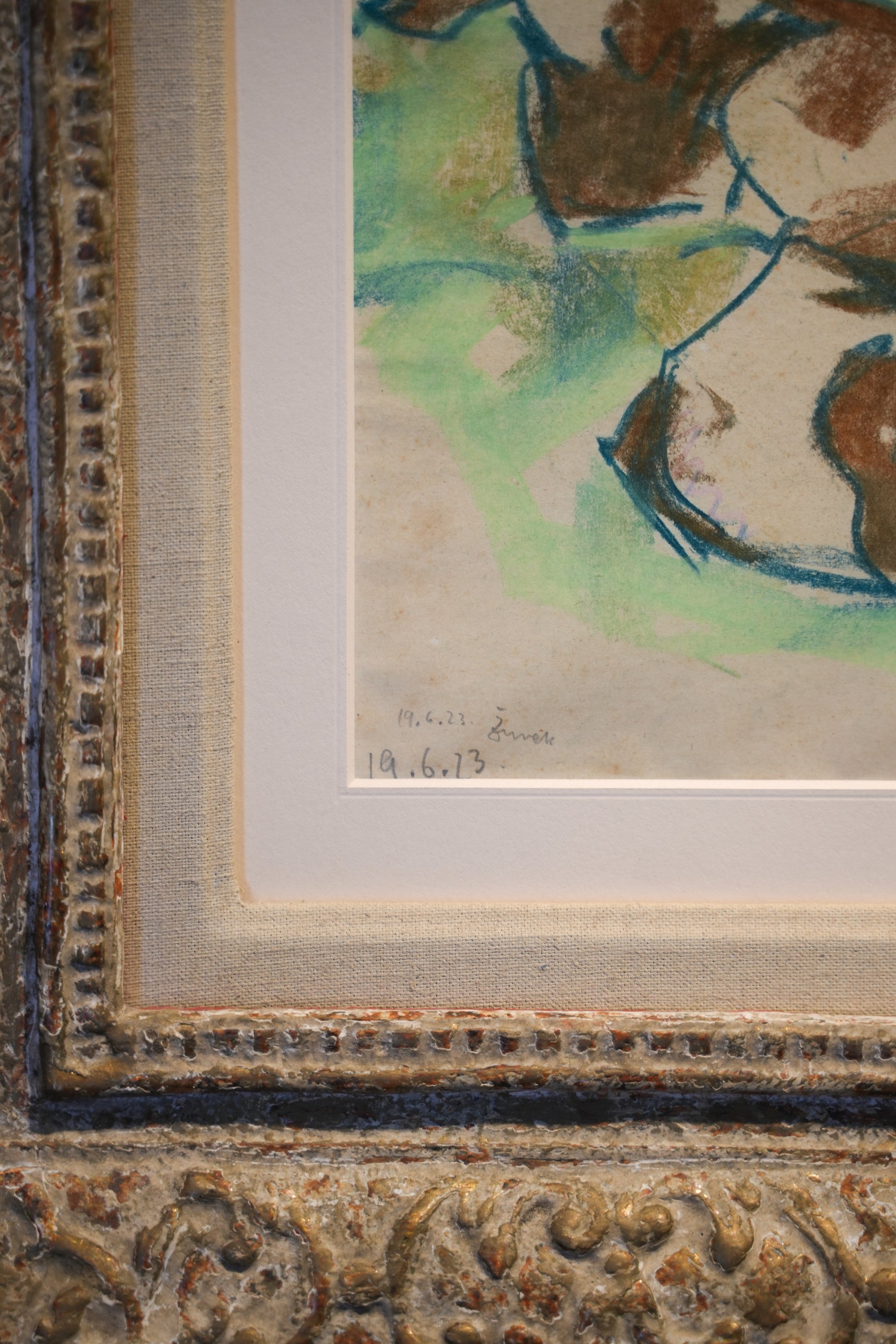 Measuring 64 cm wide x 56cm high (frame edges) we have “Cows on pasture”, a beautifully coloured chalk on paper piece which has been framed in a quality Montparnasse frame behind high end non reflective glass.