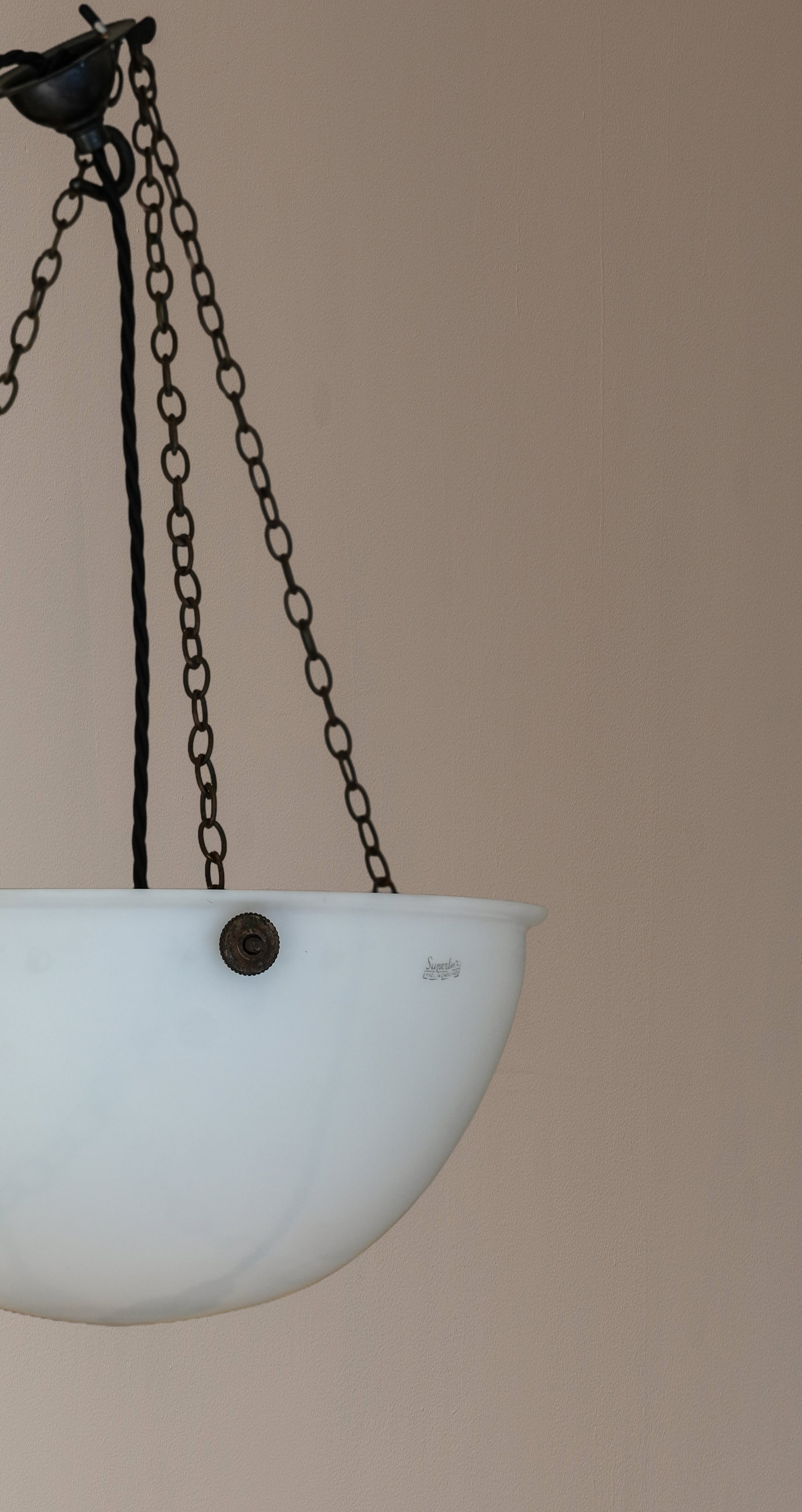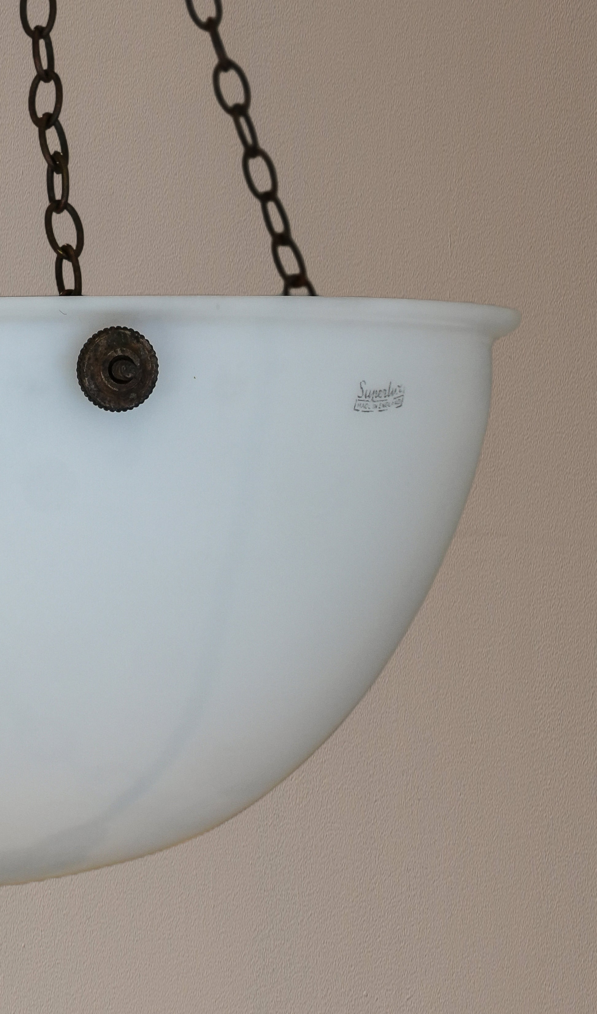 A lovely Opaline glass “Superlux” plafonnier pendant light with original brass chains.