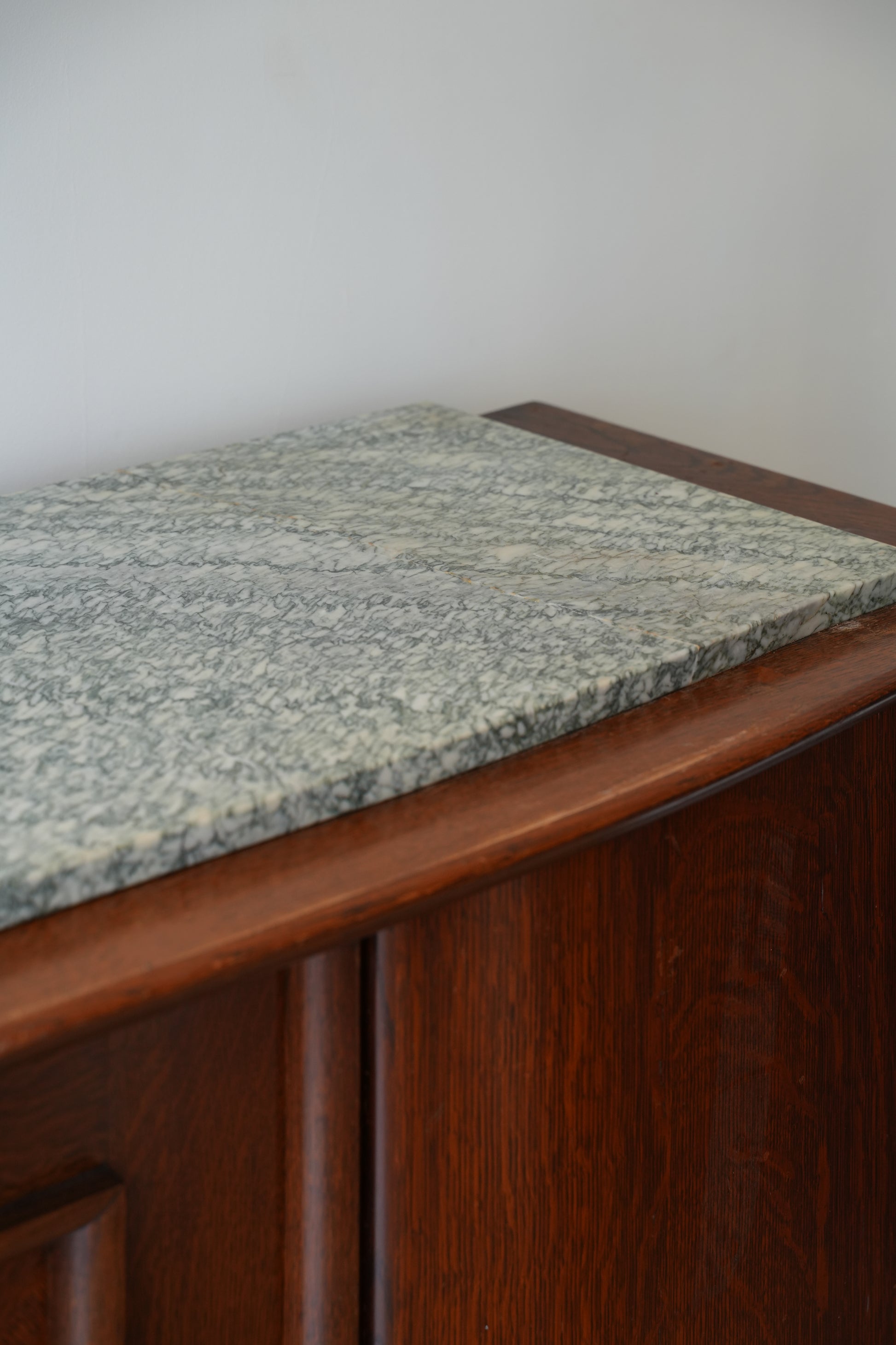A shapely 1940s oak and marble sideboard from the Haute-Savoie region in southeastern France (Auvergne-Rhône-Alpes) bordering Switzerland and Italy, famous for its dramatic Alpine scenery, Mont Blanc (4,810m), and Lake Annecy.