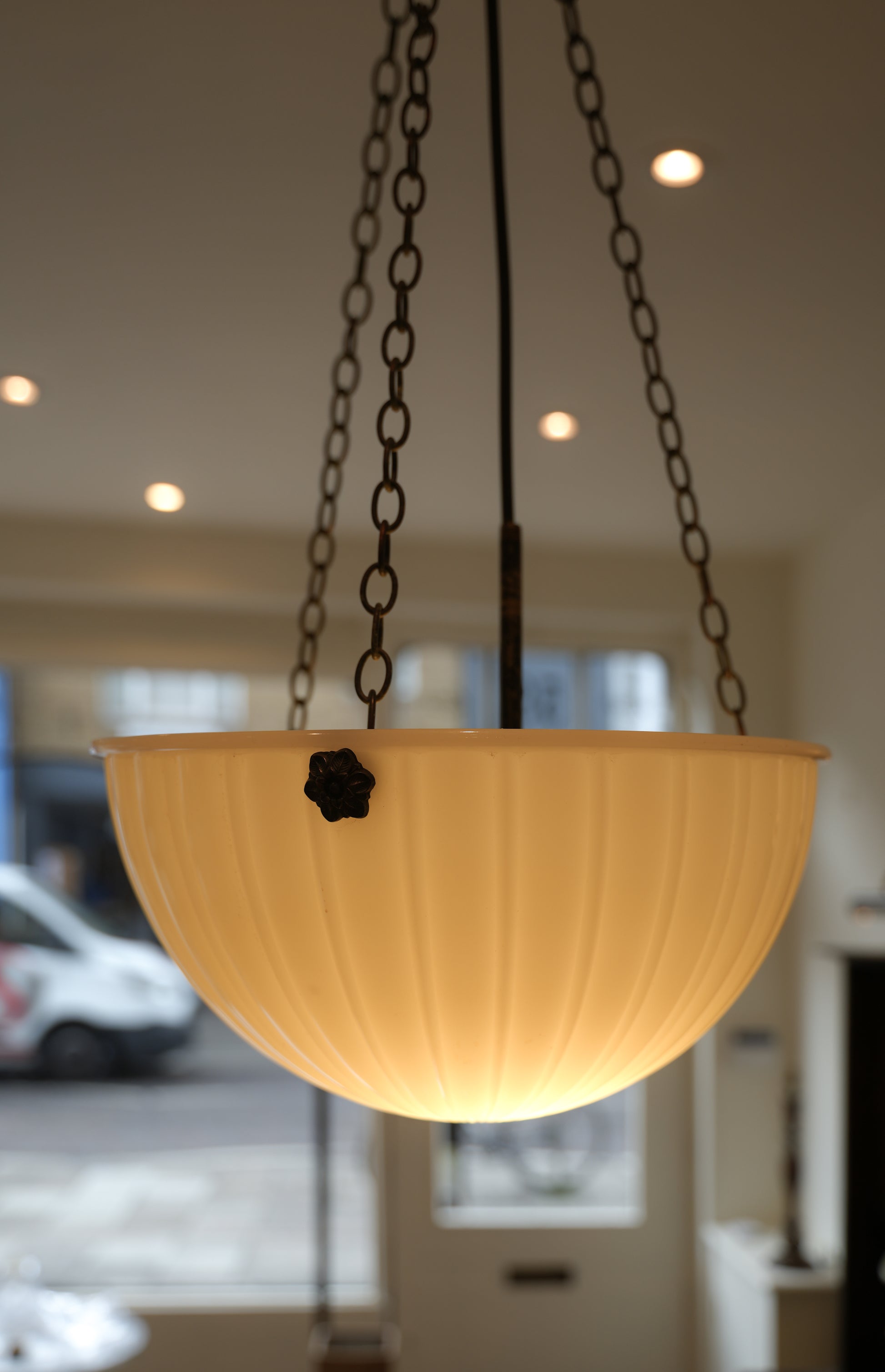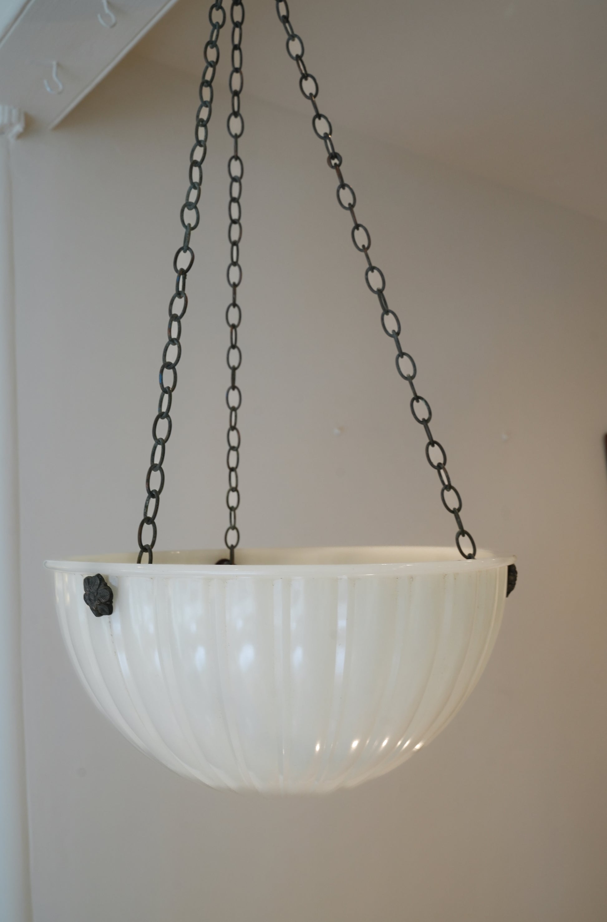 Measuring 40 cm in diameter and 20 cm deep this large pendant light hangs on its three original chains and is in excellent condition.