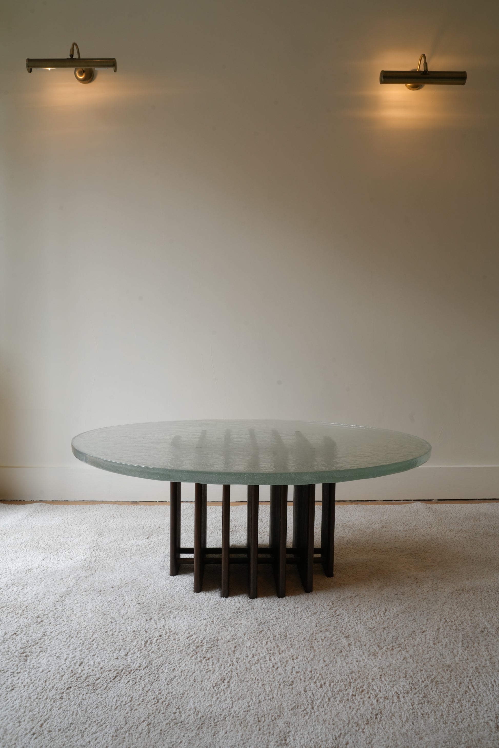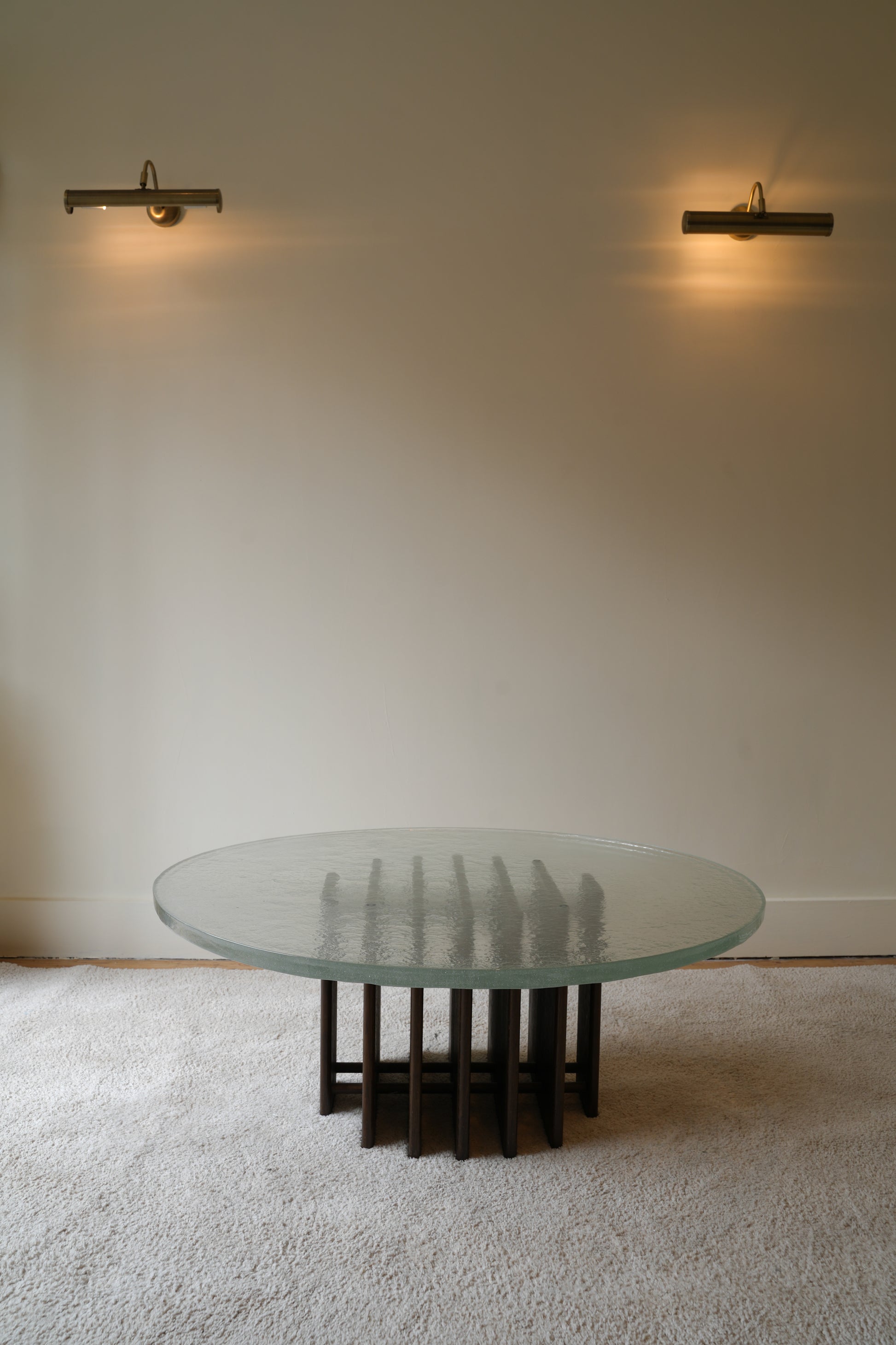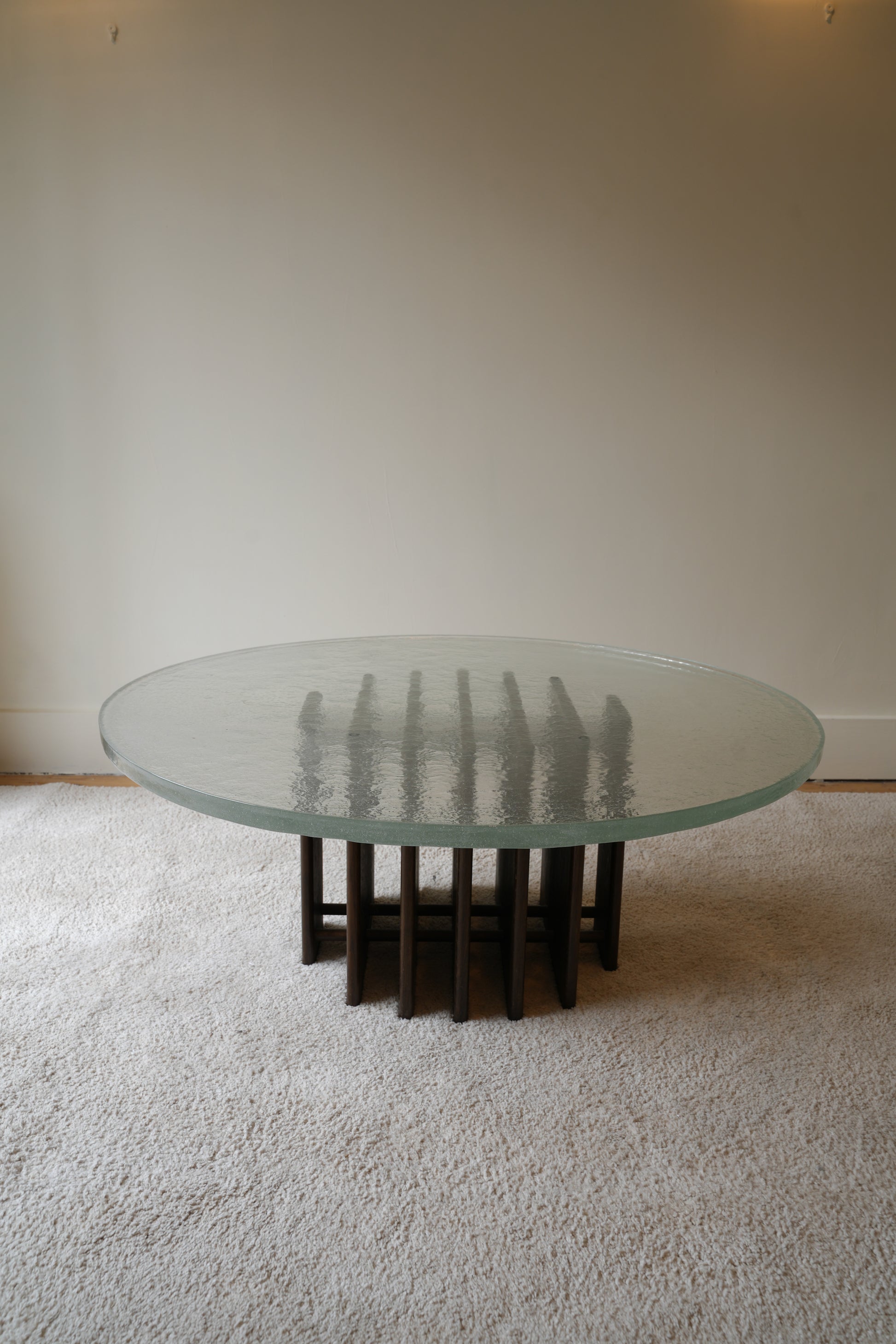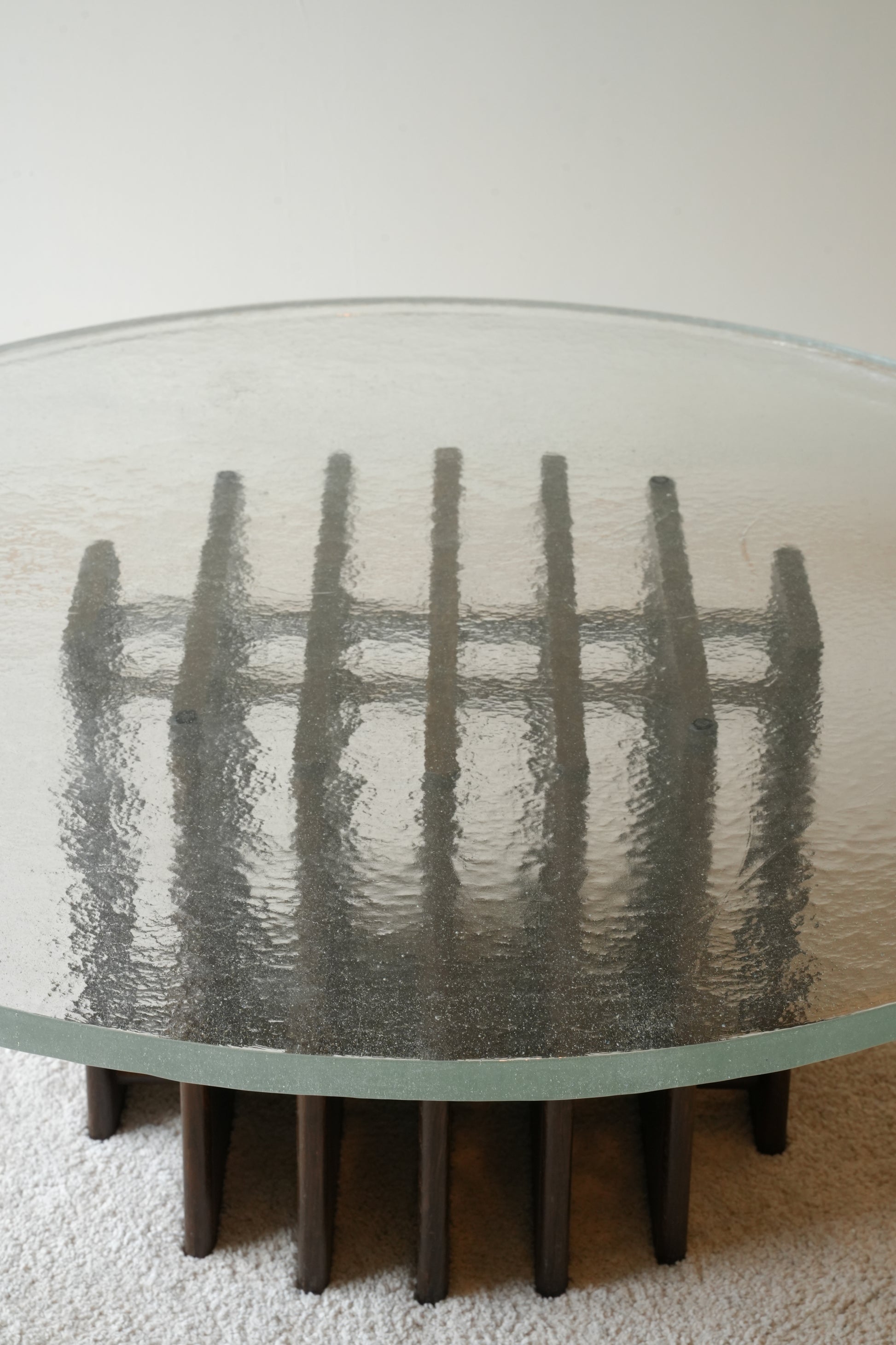 this wonderful statement coffee table has a thick, heavy and textured melted glass top that sits on top of a sculptural base.