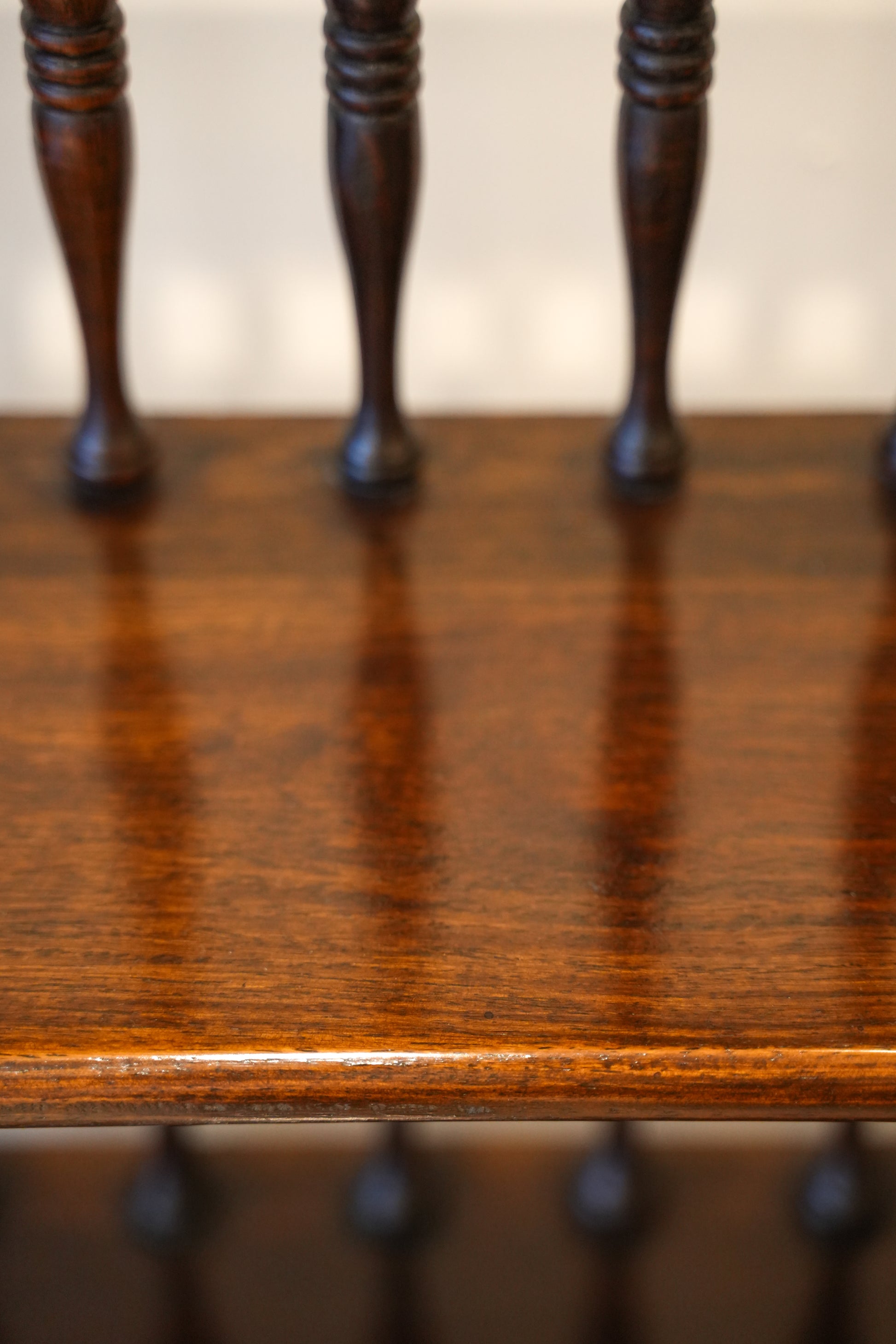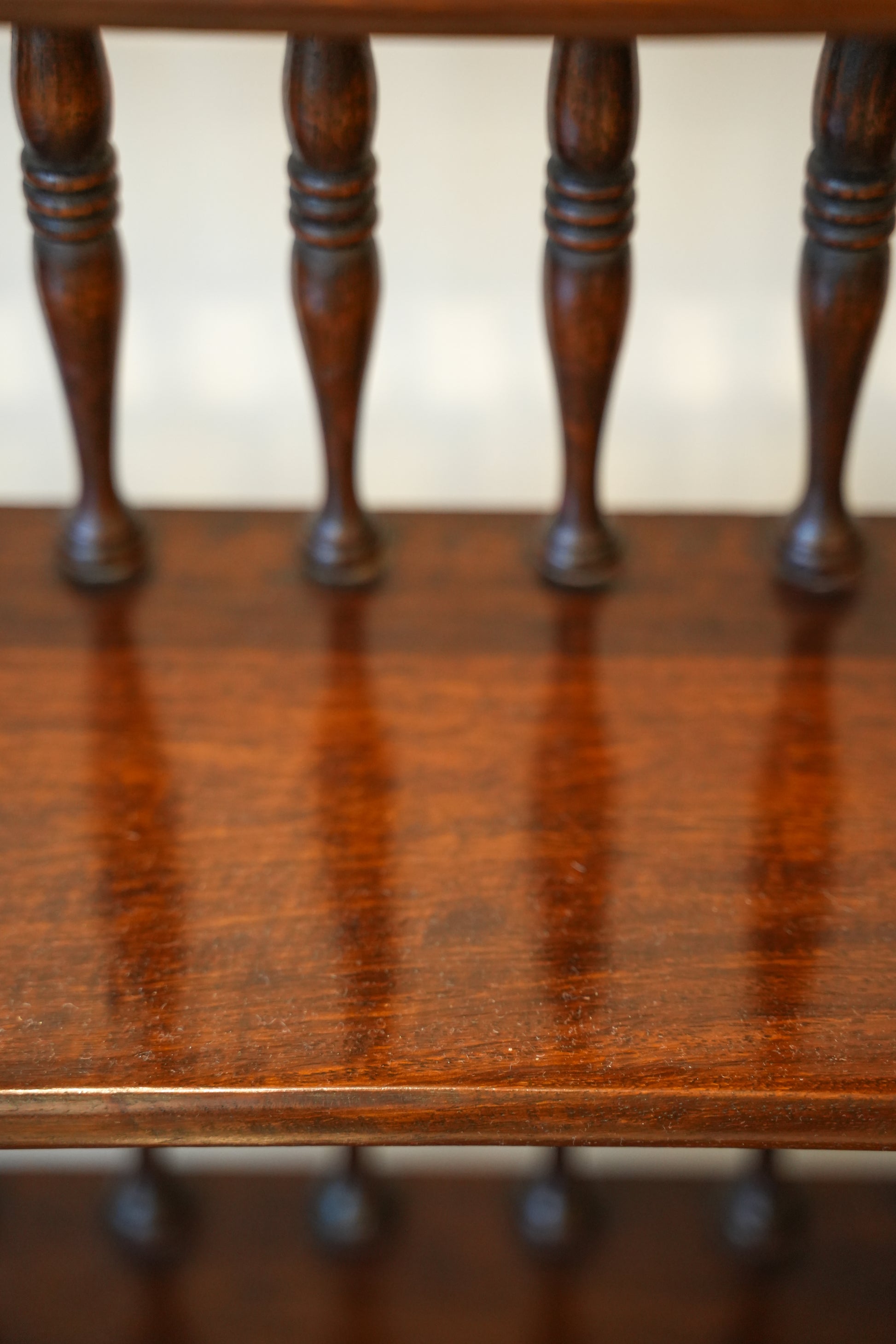Rich colour all over to the turned spindles and graduating shelves, the whole raised on bun feet.