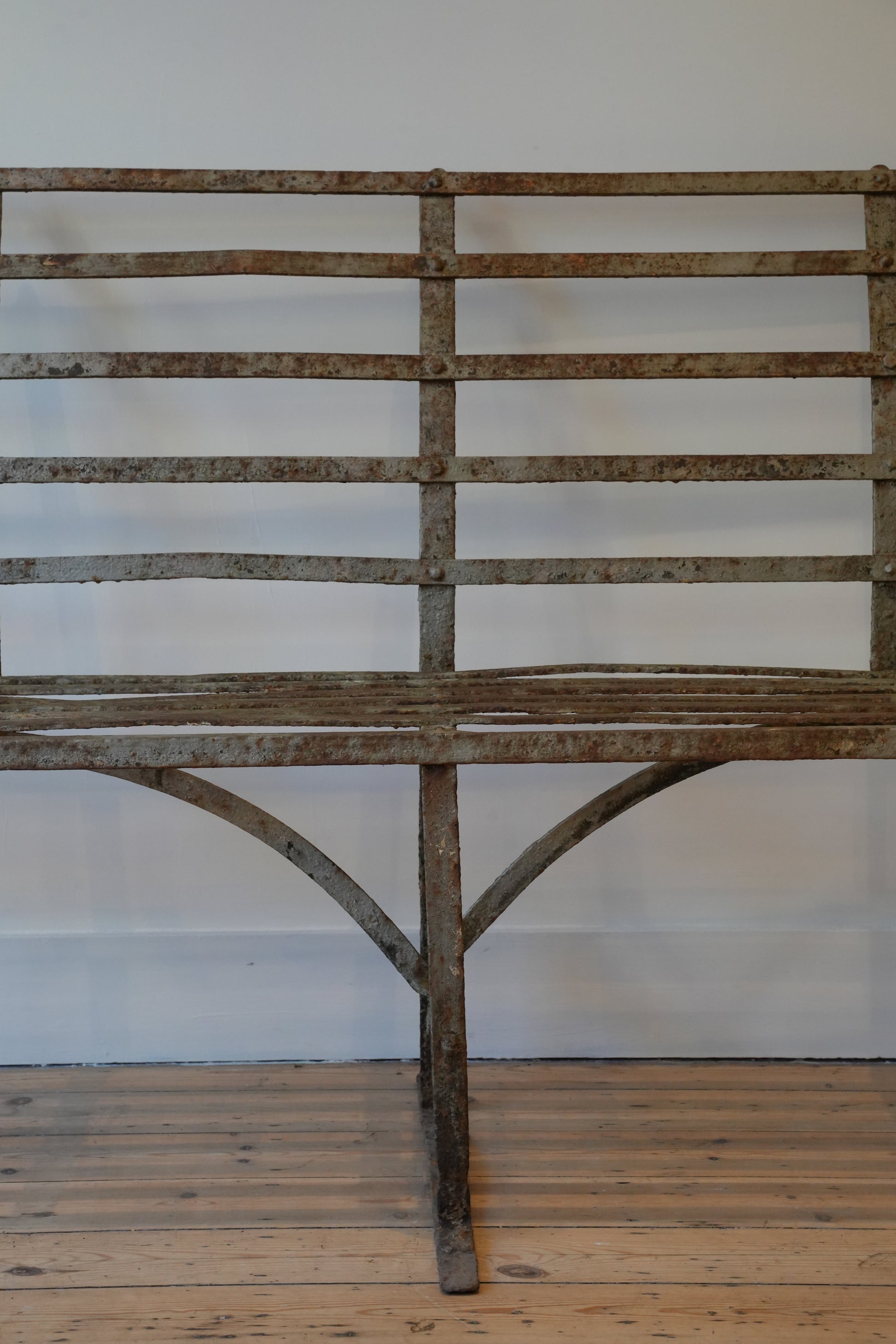A fantastic example of a large original Regency wrought iron strap work garden bench with the most beautiful paint wear all over. The pad feet were designed to stop the bench from sinking into the garden ground and the whole piece has aged beautifully whilst remaining heavy, strong, elegant and sturdy.