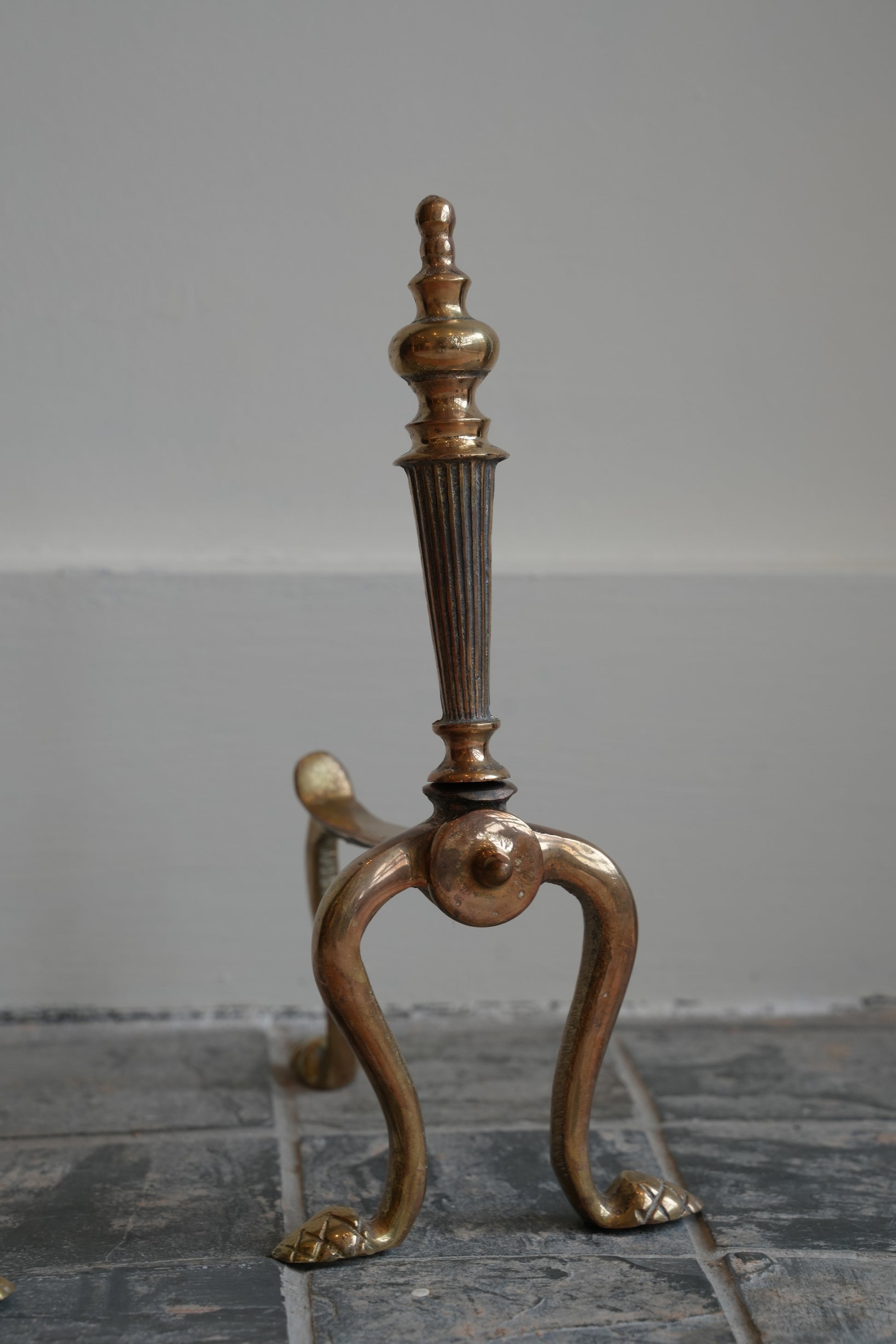 Beautiful pair of English Victorian brass fire dogs with a fluted column and cabriole legs.